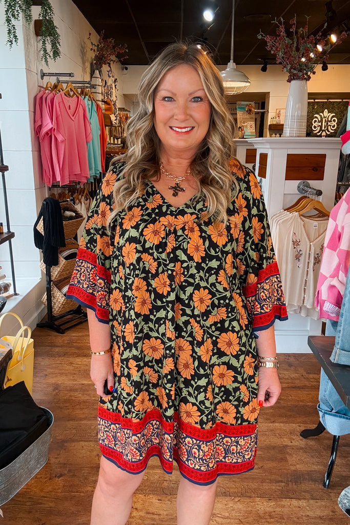 This black based dress showcases a vibrant orange and green floral print, complemented by a playful hemline and sleeve detail featuring bold red, yellow, and blue patterns. With a loose fit and pockets, it’s perfect for day-to-night adventures.