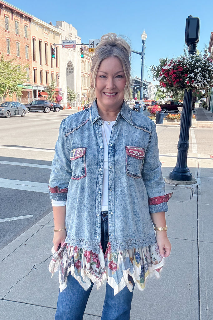 This acid wash denim long sleeve shirt from A Rare Bird is your new go-to for cute, casual style. Featuring playful patchwork detailing on the pockets and seams, plus a ruffled patchwork tier hem that adds a fun twist. The bejeweled accents add a little charm while the crocheted trim adds a touch of elegance. The button-down design makes it perfect for layering, so you can mix and match with ease. Crafted from high-quality material, this shirt keeps you comfy while turning heads—get ready to be the trendsetter wherever you go!