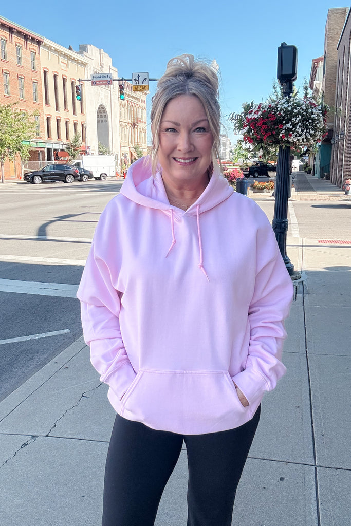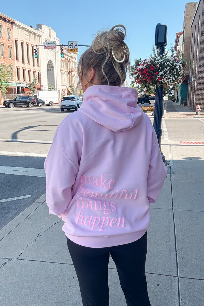 Wrap yourself in cozy comfort with this light pink hoodie featuring adjustable drawstrings and a handy front pouch pocket. The bold pink lettering "make beautiful things happen" on the back adds a playful, feminine touch that inspires positivity wherever you go. Perfect for relaxed days or layering up, you're sure to love its soft feel and uplifting vibe!