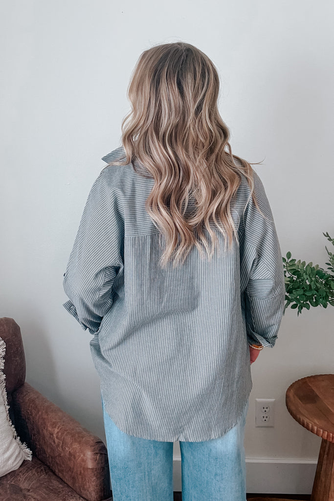 Meet the Georgia Button Up Shirt, your new best buddy for any occasion! This dark grey and white pinstripe delight is perfect for looking sharp while keeping it chill (like a cucumber in a suit). With a handy breast pocket, and cuffs that say, "I mean business," you can dress it up for the big meeting or down for a casual coffee run. Who knew versatility could look this good?