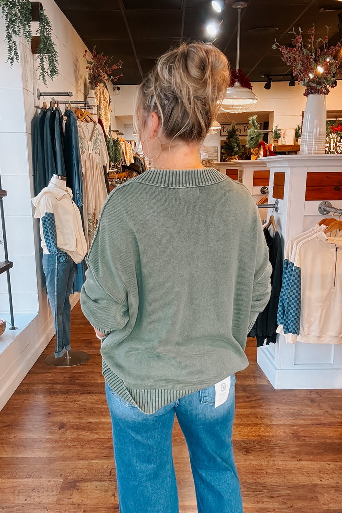 An effortlessly stylish addition to your wardrobe. With a deep v neckline, ribbed hemline, and wrist cuffs, this oversized pullover strikes the perfect balance between comfort and fashion. The seam detailing adds a unique touch to this casual piece. Go ahead, be comfy and chic.