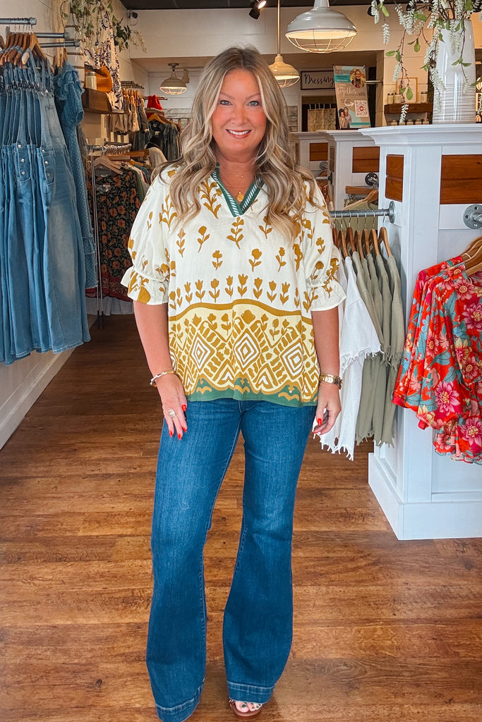 This top features a border print, puff sleeves, and a split v-neck with contrast trim. It has elastic ruffled cuffs and a flowy design.