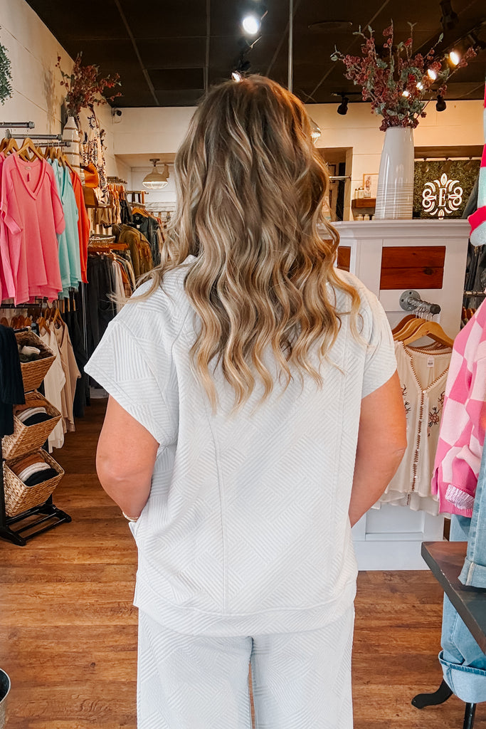 This comfy oversized short sleeve sweatshirt features a unique criss-cross design and textured finish. It has a boxy cut and a relaxed fit that you'll love to throw on and go.