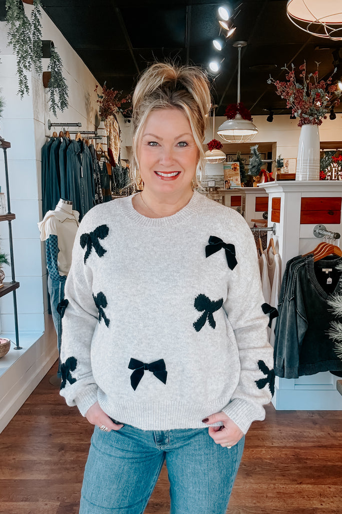 Cozy up in the Livie Bow Pullover, where soft oatmeal tones meet playful black textured knit and velvet bows. This sweater effortlessly blends cute, chic, and classy vibes, perfect for brightening up any chilly day with a touch of flirty charm.