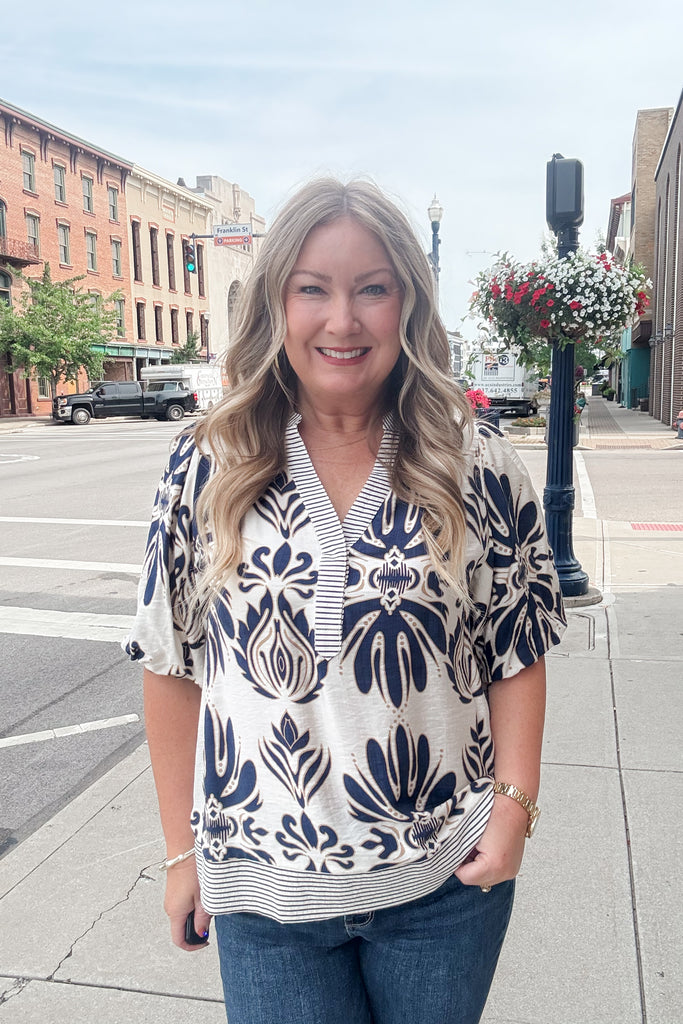 This playful short puff sleeve top in navy and white features charming striped details on the collar and hemline. Its vibrant tropical print adds a fun, summery vibe, while the snap button closure on the collar lets you style it open for layering or closed for a polished look. Perfect for brightening up any outfit with a touch of whimsy!