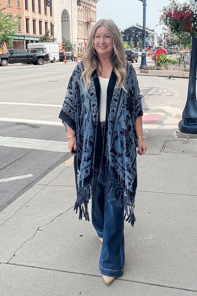 Unleash your inner fashionista with The Ezra Velvet Kimono. This elegant and sheer garment features a stunning velvet pattern design in beautiful blues, complete with playful tassels on the hem. Be the envy of the fashion crowd and add a touch of style to your wardrobe with this kimono.