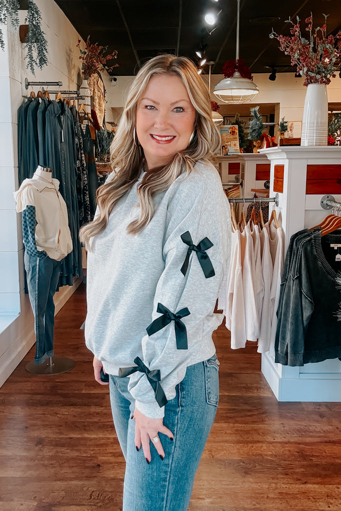 Add some flair to your wardrobe with the Adley Bow Pullover. This heather gray crew neck sweatshirt features black bows on pinch pleat sleeves, giving a playful touch to any outfit. Stay cozy and stylish with this unique pullover.