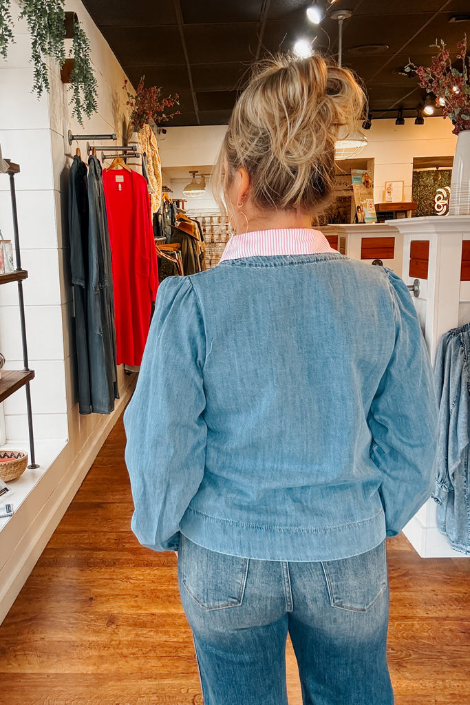 Unleash your inner fashionista with the Maria Tie Front Denim Top. Boasting elastic cuffs and lantern style sleeves, this medium wash denim top is the perfect blend of comfort and style. Plus, the two front ties add an extra touch of playfulness - perfect for layering and adding a unique flair to any outfit!