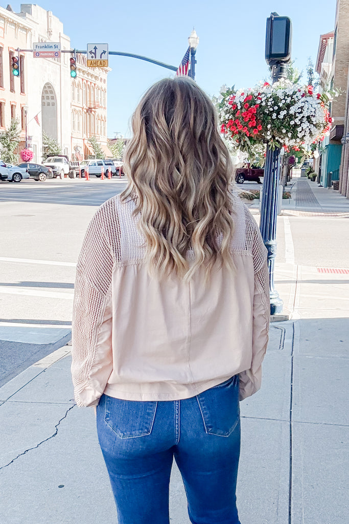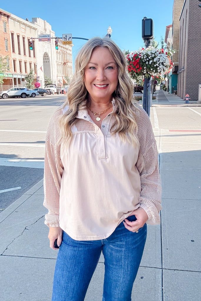 Bring a touch of fun to your everyday look with the Keira Pullover. Featuring a netted collar and sleeves for a flirty peek-a-boo effect, this sand-colored top keeps things cool and casual with a quarter button-down front. Elastic wrist cuffs add a comfy, snug fit that moves with you. This neutral piece is the perfect playful addition to your wardrobe, ready to mix and match for effortless style.